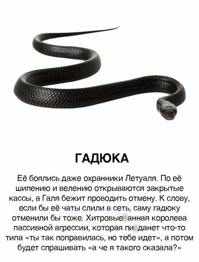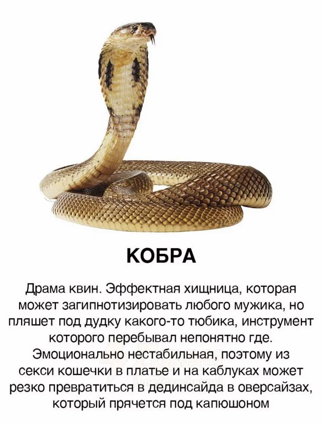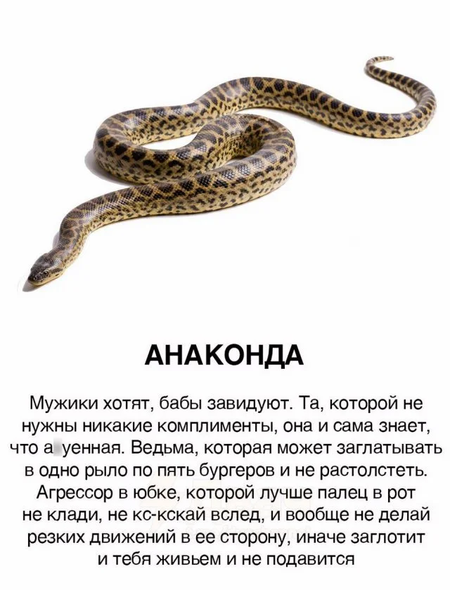Вы видели уже немало таких забавных классификаций. Но обычно они касались парней. Теперь настала очередь девушек. Подружек сравнили со змеями и вот, что из этого получилось. Дамы, проверяйте, все ли верно истолковано.