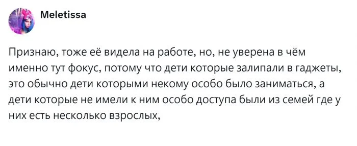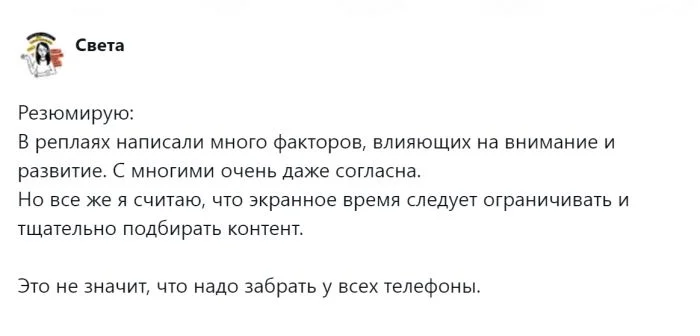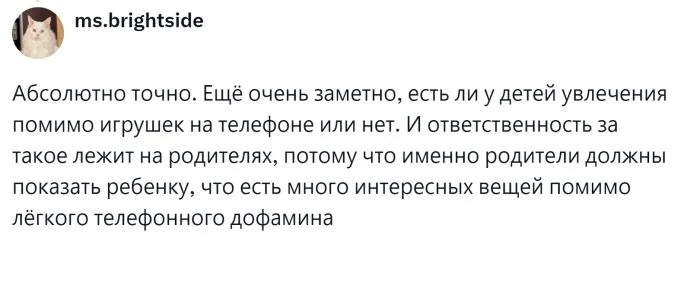 Речь идёт о времени, которое современные дети тратят, погружаясь в свои телефоны. Конечно, у этого увлечения есть плюсы: ребёнок занят, не отвлекает родителей, а также получает какую-то информацию. Однако возникают и проблемы: бывает непросто отвлечь чадо от экрана, ценность полученных знаний оказывается сомнительной, а иногда это приводит к синдрому дефицита внимания и гиперактивности (СДВГ). Пользователи обсудили эту проблему и пришли к множеству интересных выводов.