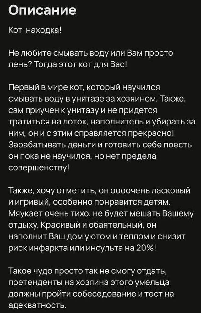 Дорогостоящие породы котов стоят очень больших денег. Но этот котофей - обычный бродяга-симпатяга. Однако, его хозяин оценил его аж в 200 миллионов рублей! Чем этот кот так уникален и удивителен, раз он стоит таких бешенных денег? У котика масса плюсов: он убирает за собой и за вами, отличается ласковым и игривым характером, а в качестве бонуса снижает риск инфаркта и инсульта на 20%. И, да, он будет смывать за вами воду в унитазе. Ради того усатого можно и кредит взять.