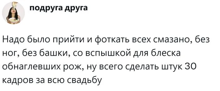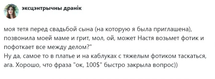 Однако некоторые предприимчивые личности приглашают знакомых не ради теплого общения, а из вполне прагматичных соображений. Причём такие "гости" получают чёткие инструкции: один будет фотографировать, другой организует развлечения, третий займётся транспортом, а кто-то возьмет на себя визаж и причёски не только для невесты, но и для её подружек, мамы, сестры, свекрови и даже любимого питомца. Как правильно реагировать на подобные "предложения", чтобы не остаться в дураках, сохранить лицо и ненавязчиво намекнуть "экономистам", что они слегка перегибают?