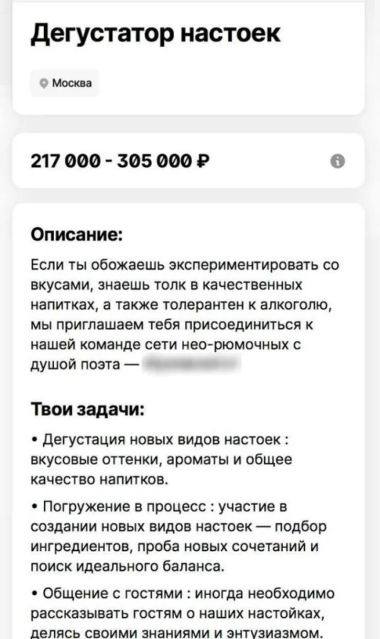 Вы ответственный и внимательный человек с душой поэта? Отлично. Для вас есть работенка. В Москве дегустатора настоек с зарплатой 305 тысяч рублей. Главная задача — тестировать вкус настоек и участвовать в создании новых. Ищут кандидата с крепким здоровьем и высокой устойчивостью к алкоголю. Работодатель предлагает гибкий график, медицинскую страховку, а также трансфер до дома в конце рабочего дня. Красота?