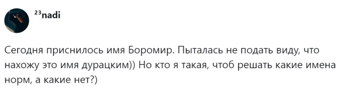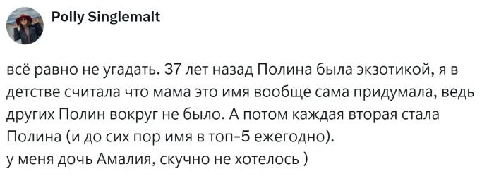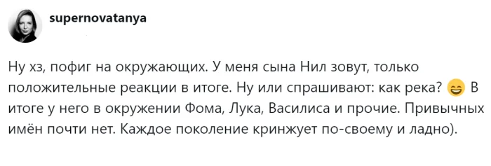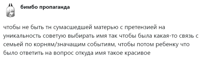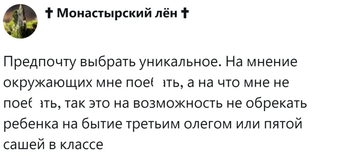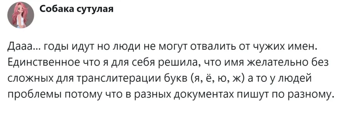 В эпоху Советского Союза никто не жаловался на то, что в каждом классе было по четыре Санька и три Наташи. Однако с приходом времени мыльных опер и фильмов, в классах начали появляться новые имена, такие как Марианна для девочек и Данила для мальчиков. Со временем людям стало необходимо что-то более индивидуальное и креативное, и на свет стали появляться не только традиционные русские имена или заимствованные, но и совершенно вымышленные. Так, в России появились девочка по имени Россия, мальчик Трамп и даже БОЧ рВФ 260602. Правда, последнего не смогли зарегистрировать, и повзрослевший юноша, имея только международный паспорт, сменил имя на Игорь. Пользователи начали обсуждать одну из главных дилемм будущих родителей – выбор имени для ребенка, но так и не пришли к единому мнению.