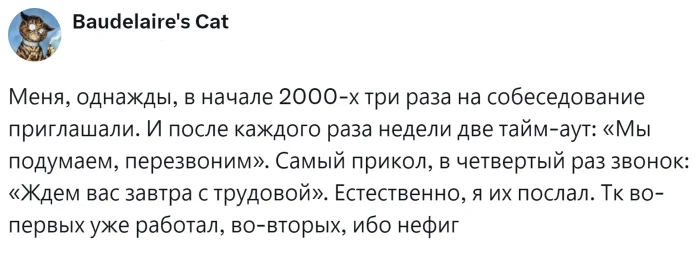 После того как вы пройдете все этапы собеседования и будете уверены, что всё прошло отлично, вы неизбежно услышите фразу: «Мы сохраним ваше резюме на случай, если появится подходящая вакансия». Эта фраза уже стала своего рода классикой в мире собеседований. Но что на самом деле скрывается за этими словами? Звонят ли компаниям, когда возникает новая возможность, или это всего лишь вежливое уклонение от ответа? Пользователи поделились своим опытом: кто-то получал звонок спустя месяцы, а кто-то так и не дождался обратной связи. Как же на самом деле обстоят дела с этой фразой в действительности?