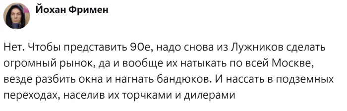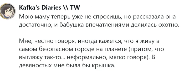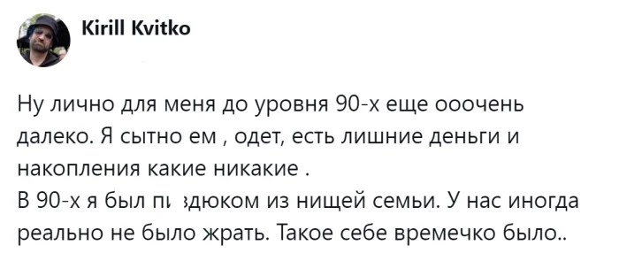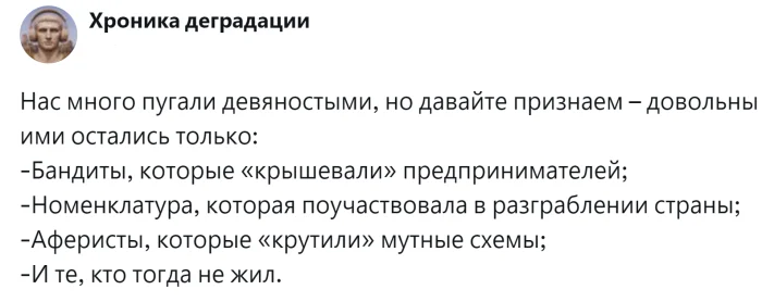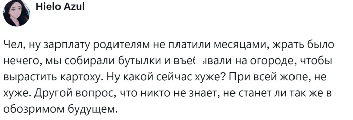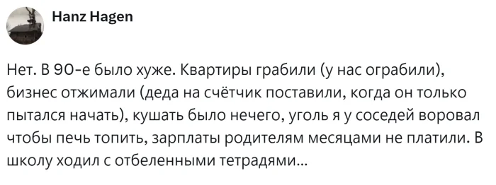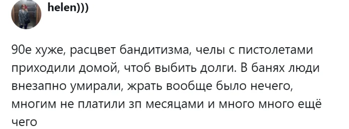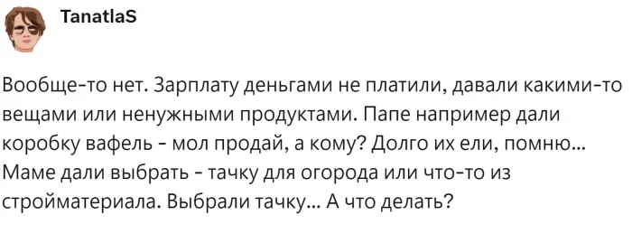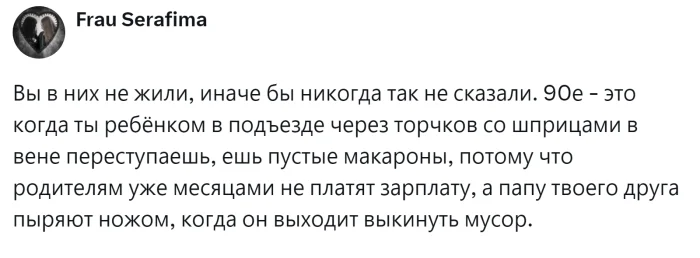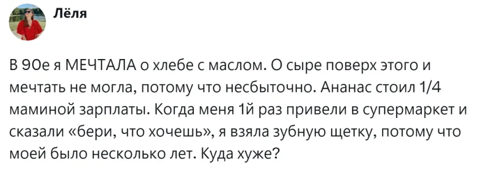 Некоторые связывают это десятилетие с потрясающей свободой, первыми шагами к рыночной экономике и неистощимым оптимизмом. Для других же оно ассоциируется с экономическими кризисами, нестабильностью, разрушением привычного уклада жизни, голодом и отсутствием перспектив. Что же делает 90-е годы одновременно притягательными и противоречивыми? Пользователи вспомнили яркие моменты и тяжелые испытания этой эпохи, оставившей глубокий след в памяти целого поколения.