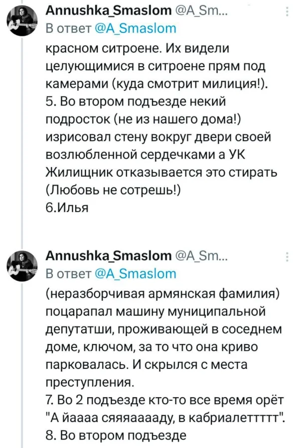 Автор твита поделилась своими впечатлениями от посещения собрания жильцов, на котором обсуждался важный вопрос о размере взносов за шлагбаум.