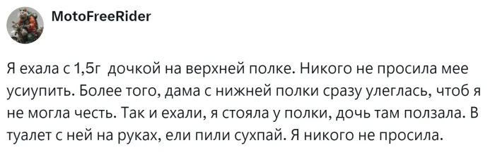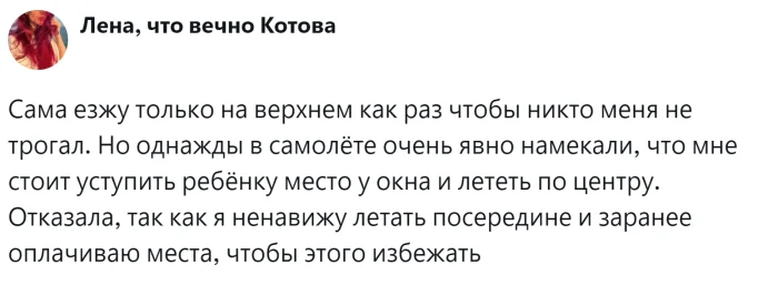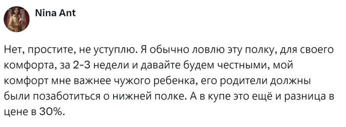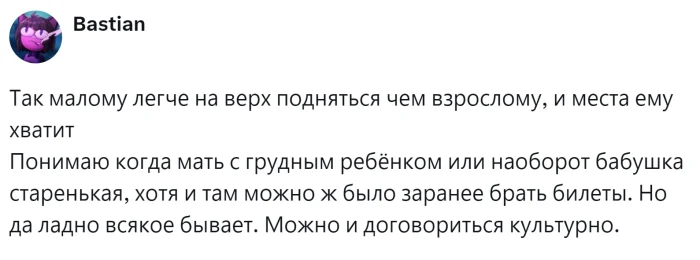 С одной стороны, забота о комфорте и безопасности маленького пассажира имеет первостепенное значение. С другой стороны, билеты покупались заранее и часто стоят гораздо дороже. Родители должны были позаботиться о комфорте своего малыша за свой счет, а не за счет окружающих. Пользователи обсуждали распространённую ситуацию, делились своим опытом и пытались определить границу между добротой и личным комфортом.