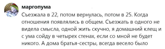 Это естественно, ведь рано или поздно дети покидают родительский дом, чтобы начать самостоятельную жизнь. Однако иногда это происходит слишком рано или, наоборот, затягивается. Пользователи попытались обсудить, в каком возрасте лучше всего уезжать от родителей, существует ли вообще идеальный момент для этого и какие факторы могут препятствовать началу независимой жизни.