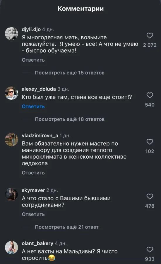 Однако реакция на объявление о наборе персонала оказалась совсем иной. Комментарии под вакансией были заполнены откликами не от бородатых гигантов, жаждущих романтики северных широт, а от... мамочек в декрете!