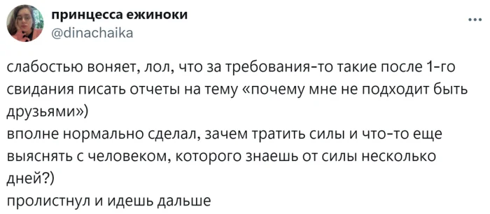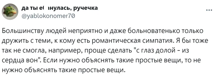 Некоторые люди убеждены, что если после неудачного романа тебя окрестили просто другом, то необходимо продолжать попытки завоевать сердце девушки. Иначе, по их мнению, тебя можно будет считать человеком, который относится к женщинам как к простому товару или услуге, не проявляя к ним настоящего уважения и интереса.