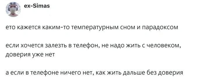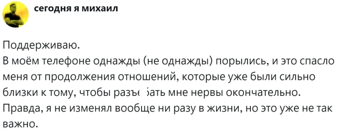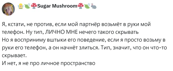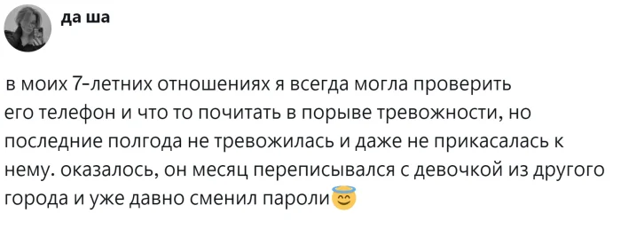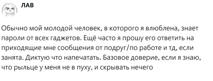 А как вы относитесь к тайной проверке телефона супруга или партнёра? Поделитесь своим мнением в комментариях.