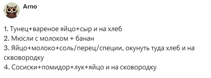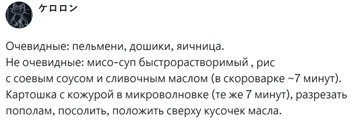 Приготовление полноценных блюд часто требует значительных временных затрат. Однако у большинства из нас есть несколько проверенных рецептов быстрых блюд - настоящих пяти- или десятиминуток, которые выручают, когда совершенно нет времени на готовку. Пользователи поделились своими кулинарными секретами. Некоторые варианты оказались необычными, но вполне достойными внимания.
