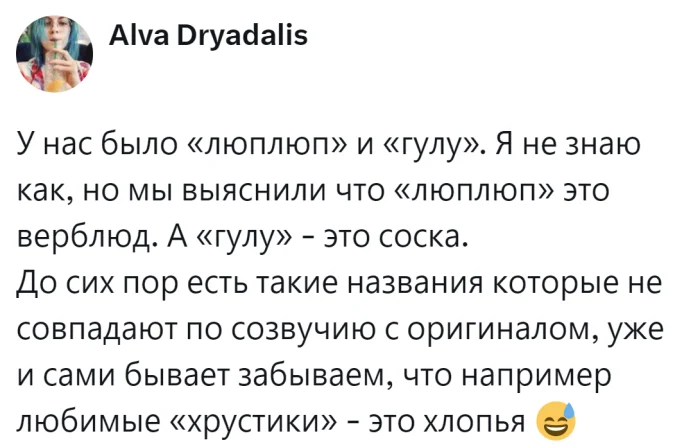 Когда дети взрослеют, они часто отказываются признавать свои детские лингвистические творения, которые когда-то казались им гениальными. Некоторые из этих выражений удаётся разгадать, а другие остаются загадкой. Пользователи делятся своими воспоминаниями и наблюдениями, подтверждая, что детские таланты безграничны.