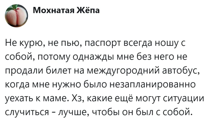 В обществе разгорелся занимательный диспут. Зачем всегда держать при себе паспорт? Какие преимущества это даёт — дополнительную страховку, уверенность в себе или ощущение защищённости? Может быть, человек подсознательно стремится доказать свою порядочность, благонадёжность и законопослушность?