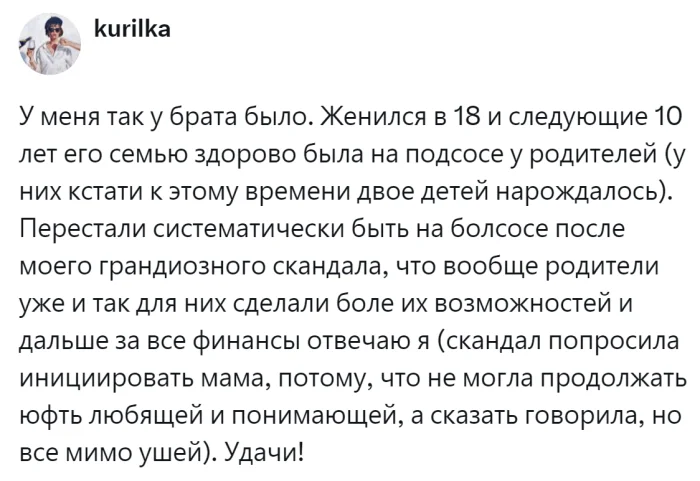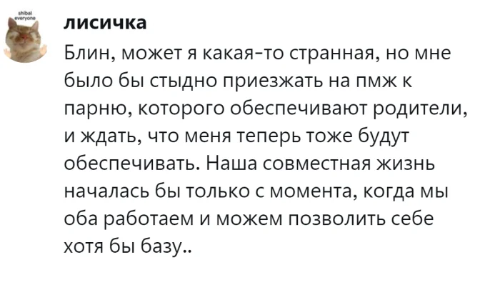 Особенно учитывая, что для более инфантильного поколения зумеров стало нормой приводить свою пассию домой, не задумываясь о серьёзных планах на совместное будущее. Молодёжь можно понять — ведь это же любовь. А все материальные и бытовые вопросы можно переложить на плечи родителей, которые в этот момент тихо ужасаются, готовятся к новой ответственности и делятся переживаниями с такими же "счастливчиками" в интернете.