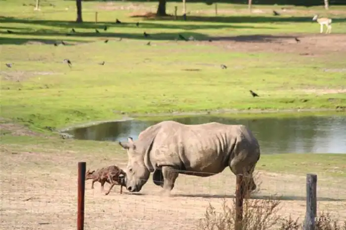 странно, неужели носорог принял такого мелкого за угрозу...да и молодых детёнышей не видать(можь жаба?хотя нет, не похоже ,не знаю ..немотивированная агрессия по-поводу нарушения территории