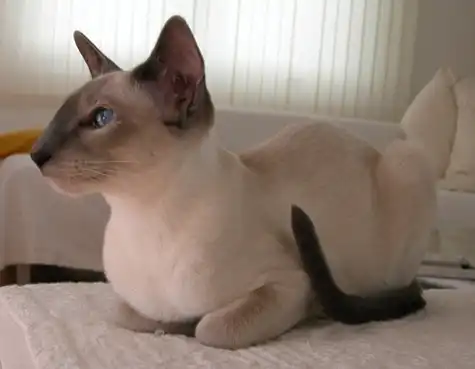 Описание. Сиамская кошка - средней величины, элегантного, легкого сложения при хорошо развитой мускулатуре. Тело длинное, трубообразное, ноги стройные, длинные, лапки маленькие, овальные. Хвост длинный, тонкий, с заостряющимся кончиком. Голова в форме узкого, длинного, ровного клина. Плавно-выпуклый узкий череп изящным изгибом переходит в высоко поставленную длинную шею. Профиль прямой; нос широкий и длинный, подбородок сильный. Уши большие, широко расставленные, широкие в основании, с заостренными кончиками. Поставлены таким образом, что продолжают боковые линии клина, образуя в плане при взгляде анфас равносторонний треугольник. Глаза миндалевидной формы, косо поставлены, синие (насыщенный цвет предпочтителен). Шерсть сиамской кошки короткая, тонкая, нежная, без подшерстка, плотно прилегающая, с глянцевым блеском.