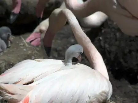 Начало брачного периода зависит у фламинго от обилия корма. Поэтому никто не знает, будут ли заняты известные места гнездовий в какое-то время года. В 5-дневном возрасте птенцы покидают конусовидные гнезда из песка и ила и присоединяются к "детскому саду". Такие группы молодняка могут насчитывать сотни голов и служат для защиты от врагов. Но это не означает, что взрослые фламинго кормят всех птенцов без разбора — они приносят еду лишь собственному чаду, которого узнают по голосу и поведению.