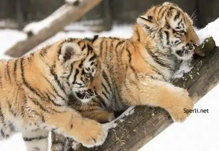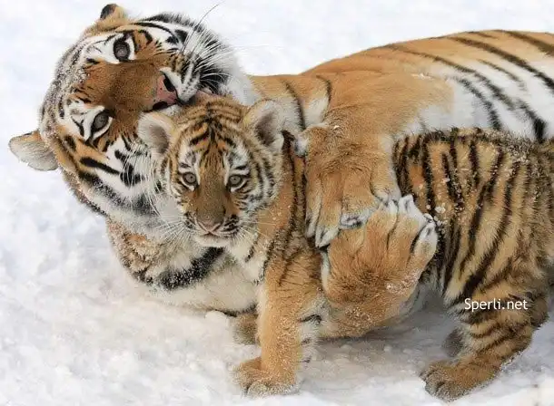 Тигрица Ирис из красноярского парка флоры и фауны "Роев ручей" вместе с одним из своих двух, родившихся два месяца назад, малышей.