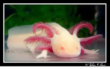 Особые приметы: По бокам головы у аксолотля растут длинные, лохматые веточки, по три с каждой стороны. Это жабры. Периодически личинка прижимает их к телу, встряхивает ими, чтобы очистить от органических остатков. Хвост у аксолотля длинный и широкий, что хорошо помогает ему при плавании. Интересно то, что аксолотль дышит и жабрами, и лёгкими — если вода плохо насыщена кислородом, то аксолотль переходит на лёгочное дыхание, и со временем жабры у него частично атрофируются.
