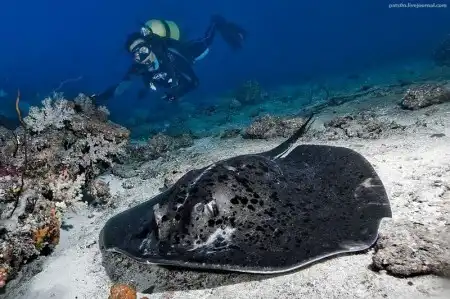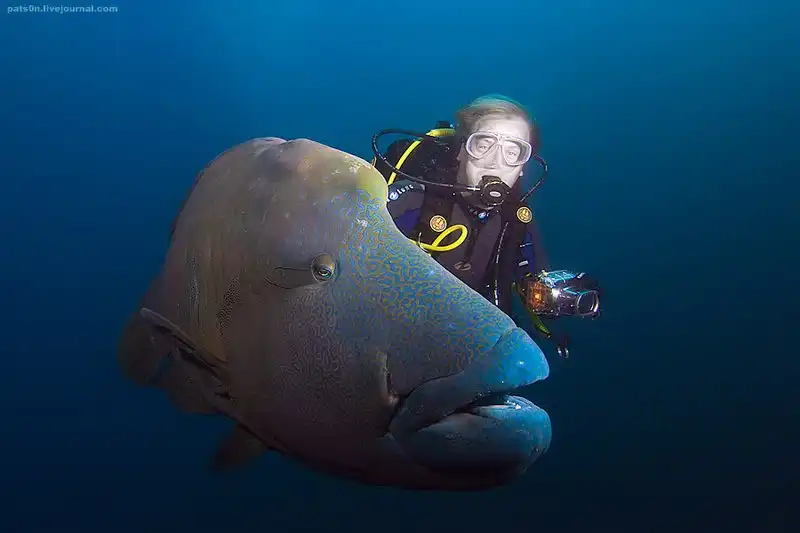 Эта огромная рыба - великий и вечный Наполеон, он с дайверами давно дружит и любезно соглашается попозировать перед камерами, за что его подкармливают:)