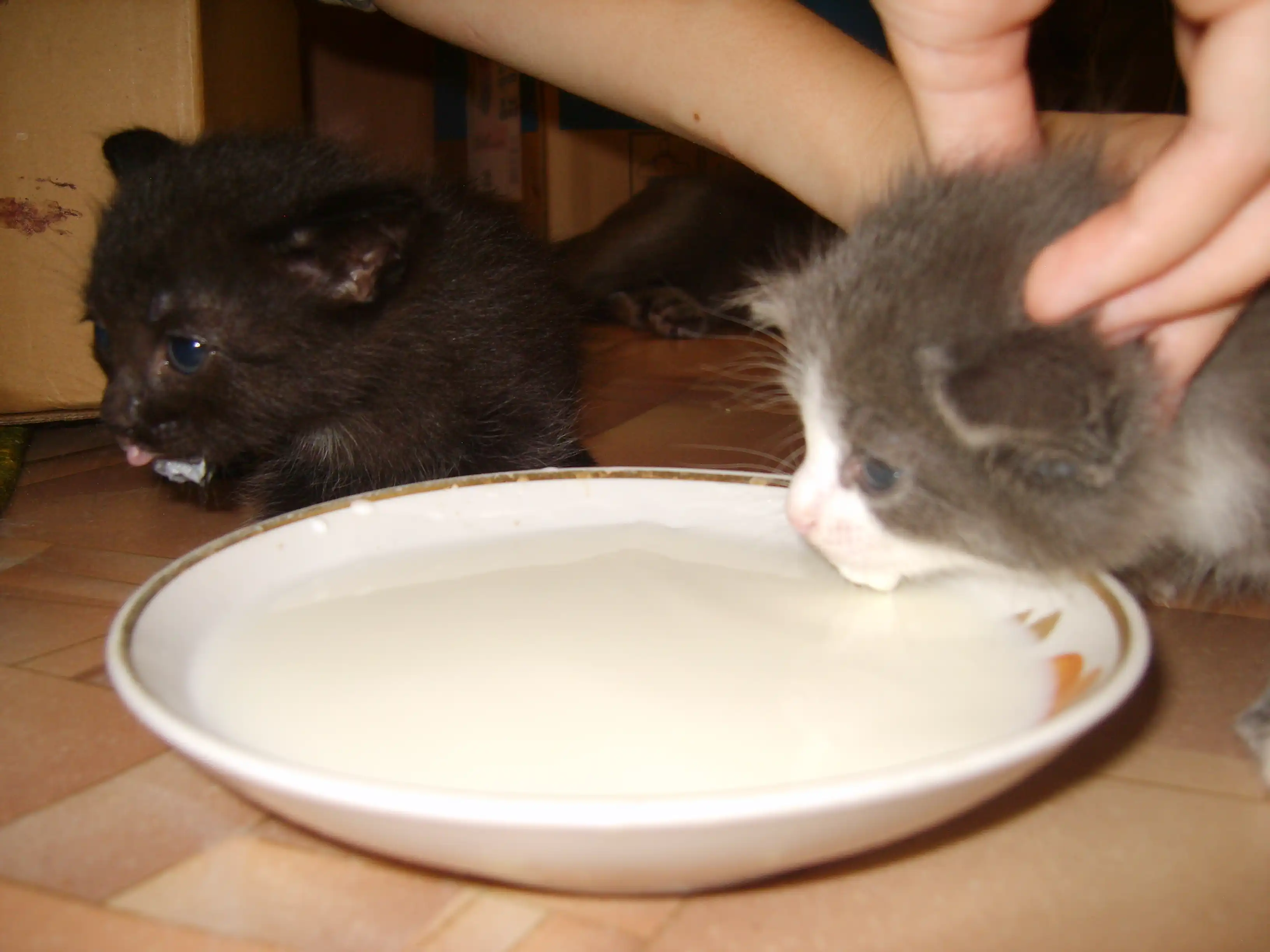 "Лица" у них потерянные потому как времени им еще очень мало. А в чашку мы их не топим, а наоборот держим. Они пока сообразить не могут, что молоко оно только в чашке, а вокруг чашки и везде его нет. И в итоге просто воздух облизывают - молоко ищут...