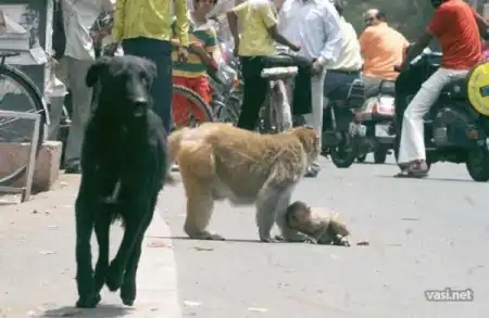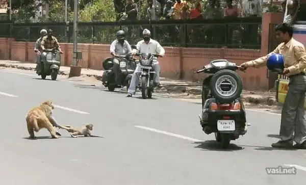 Мопед сбил маленькую обезьянку, к ней тут же с дурными намерениями подбежала собака, но спасение пришло неожиданно!