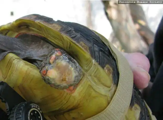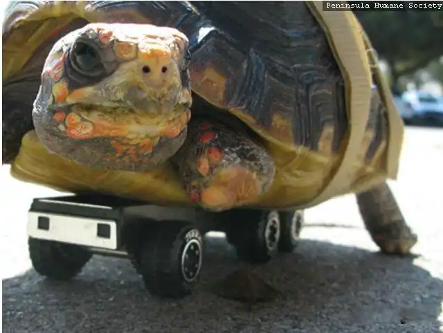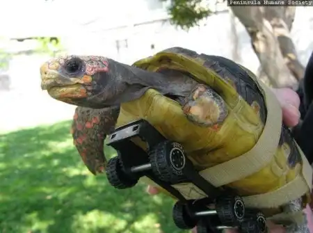 Эта несчастная черепаха попала под автомобиль и осталась без передней лапы.Но добрые люди не бросили животное в беде.Теперь у нее есть протез, с помощью которого она может передвигаться.