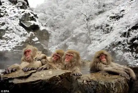 Журналист Хьюго Дениэл запечатлел японских макак на отдыхе около источника в Яманучи. Эти животные отличатся исключительной сообразительностью. Они не просто пережидают зиму, мучаясь от холода и голода, они нашли удивительный способ согреваться