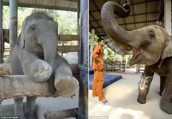 Будучи в семимесячном возрасте, слониха Моша наступила в лесу на мину и ей оторвало часть передней ноги. Её нашли и вылечили в приюте для слонов в Лампанге, Тайланд и сделали протез, первый в мире для слонов. Теперь у нее вроде бы все хорошо и забота есть и любовь.