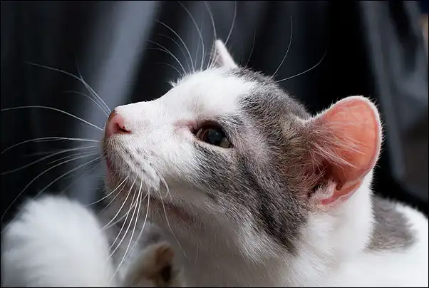 Кот кастрирован, очень крупный, имеет неповторимую внешность, окрас белый с голубыми пятнами, удлиненная форма туловища и лап, вытянутая морда, ярко-янтарные глаза. Возраст кота около двух лет.