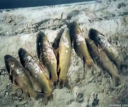 Либо это сазан на нерест пошел, раз настолько отупел, что позволяет какой-то шавке ловить себя. Либо эта рыба уже давно была поймана кем-то другим, например хозяином))