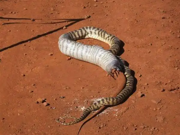 как кожа у змеи еще не лопнула, всеже есть предел растяжениюэ. Ящерица-тоже хищник, так что хищник ест хищника. и вообще перво наперво змея душит свою жертву а потом ест.