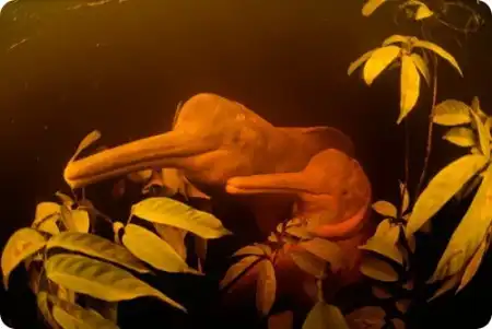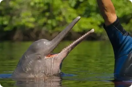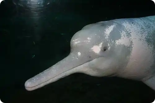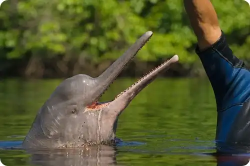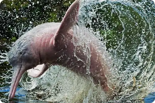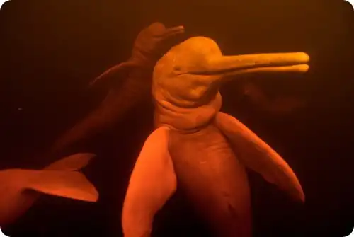 Амазонский дельфин, которого также называют инией или боуто, является самым крупным речным дельфином. Inia geoffrensis, как называют его ученые, достигает 2,5 метров в длину и массы 2 центнера. Светло-серые молодые особи с возрастом светлеют. Тело у амазонского дельфина полное, с тонким хвостом и узкой мордой. Круглый лоб, немного загнутый клюв и маленькие глаза – особенности этого вида дельфинов.