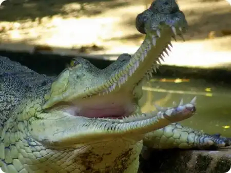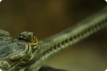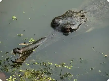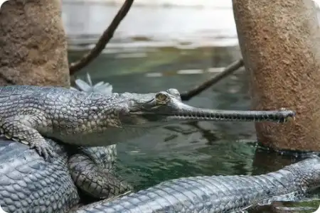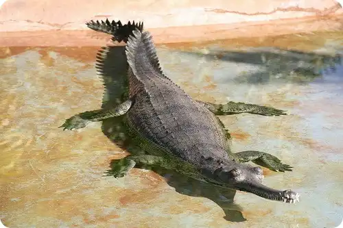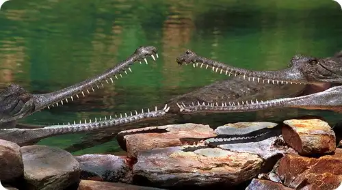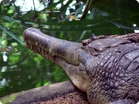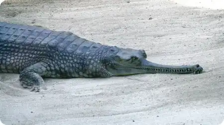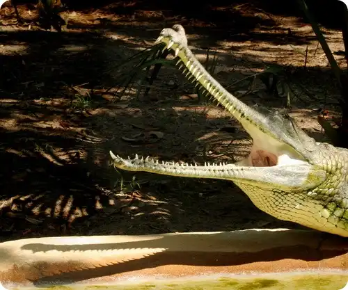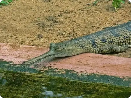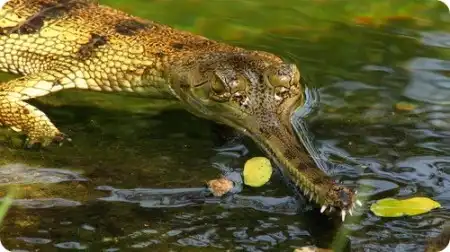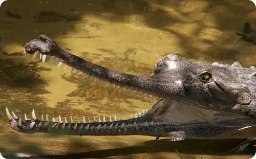 Гавиал – один из представителей отряда крокодилов, единственный вид в семействе Гавиаловых. Из внешних отличий можно отметить узкую, длинную морду. Ширина ее в три раза меньше длины. С возрастом морда гавиала становится еще уже и длиннее. В связи с тем, что гавиал питается рыбой, зубы у него длинные и острые, расположенные с небольшим наклоном для удобства принятия пищи.