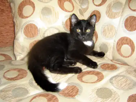 У котёнка медового цвета глаза и замечательный окрас - чёрная, мягкая шубка,