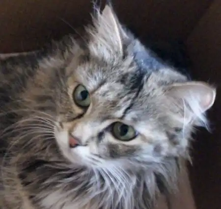 Кошечке примерно 2 года. Окрас ее настолько необычен, что описать ее невозможно, толи она полосатая. толи черепаховая, но очень пушистая с великолепным хвостом.