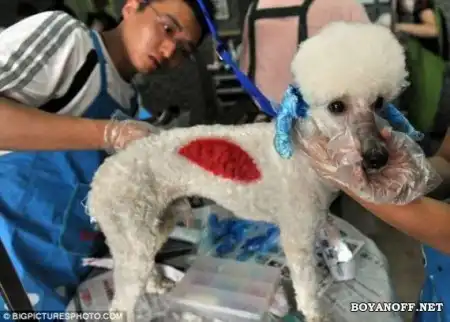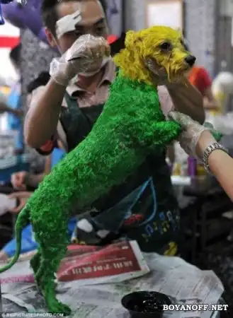 Ладно себя краской уродуют красясь во все цвета радуги,а над животными то зачем так издеваться!?