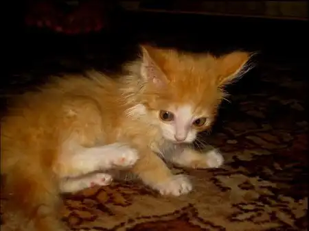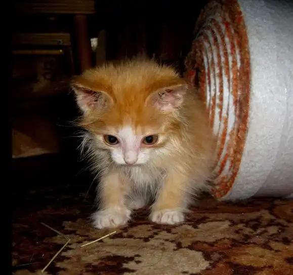 найден котенок сегодня. посреди дороги. В ужасном состоянии. уши забиты чем то были, шерсть - в колтунах. хвостик надломлен. Мальчик. 1, 5 мес.