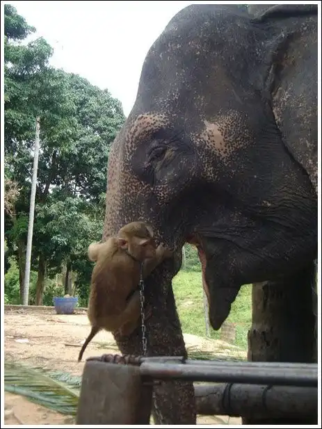 ПРикольная обезьянка, и не боится же в рот лест к слону))