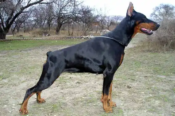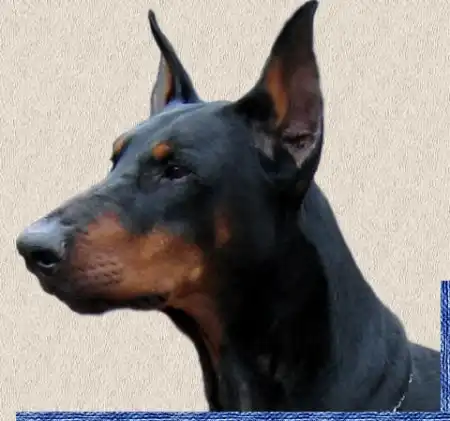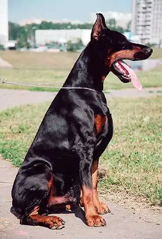 Высота в холке кобелей 68 - 72, а сук - 63 - 68 см. Голова при осмотре спереди и сверху хорошо сложенного добермана должна иметь форму вытянутого тупого клина. Длина черепа должна соответствовать длине морды собаки. Поперечная линия темени, если смотреть спереди, должна быть по возможности горизонтальной, то есть не снижаться к ушам. Линия лба снижается к затылку с легким закруглением, являясь параллельным продолжением линии спинки носа. Надбровные дуги хорошо развиты, но не выступают. Затылочный бугор выражен, но не резко. Лобный выступ слабо выражен. Челюсти широкие и сильные. Прикус ножницеобразный. Скулы должны быть плоскими. Широкие и крепкие челюсти обеспечивают доберману сильную хватку, что очень важно для служебной собаки. Глаза средней величины, миндалевидной формы: некруглые, нераскосые, не слишком выпуклые, не слишком глубоко посаженные. Цвет глаз должен быть как можно темнее. Уши высоко поставлены. Уши можно как купировать, так и не купировать. Шея достаточно длинная, сухая и мускулистая, постепенно расширяющаяся к основанию. Постав шеи прямой и высокий. Зрительно она должна четко отграничиваться от головы и гармонично сочетаться с головой и туловищем собаки. Грудная клетка широкая и глубокая, с хорошо выраженным килем. Формат добермана почти квадратный, особенно у кобелей. Корпус сильный и крепкий. Спина прямая, крепкая, достаточно широкая и мускулистая. Поясница короткая, мощная и глубокая. Круп имеет слегка округлую форму. Хвост высоко посажен и коротко купирован. Конечности сильные и мускулистые. Кожа прилегает плотно и хорошо пигментирована. Шерсть короткая, жесткая и густая. Плотно прилегает к коже, гладкая. Наличие подшерстка не допускается. Окрас черный и темно-коричневый с темно-рыжими подпалинами. Подпалины четко отграничены и расположены на морде в виде пятен на щеках и верхних веках, на горле, груди, пястях, плюснах и лапах, на внутренних поверхностях бедер, вокруг анального отверстия и на седалищных буграх.