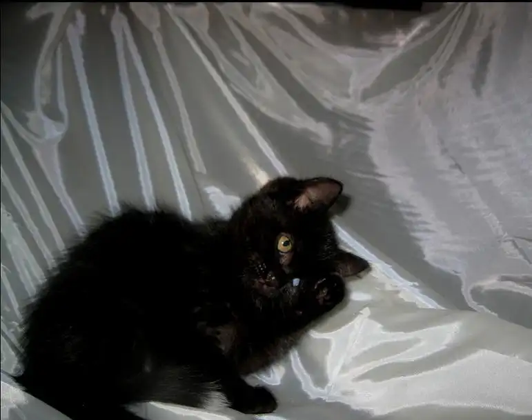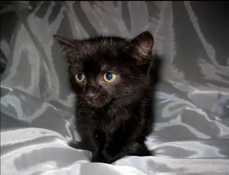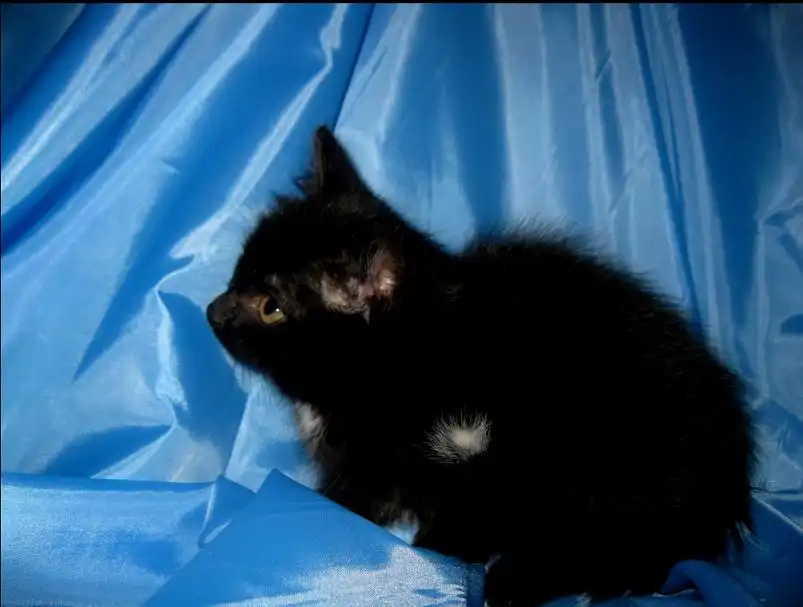 Кисточка - маленькая, робкая девочка, совершенно черная, на шейке и на кончике хвостика небольшие белые пятнышки. За пятнышко на кончике хвостика она и получила свое имя. Шерстка у Кисточки мягкая, бархатная, напоминает шерсть британцев. Девочка очень милая и живописная. лоточком пользуется, ест сухой и влажный корм. Кисточка найдена в подвале на рынке, ей около 2 мес.