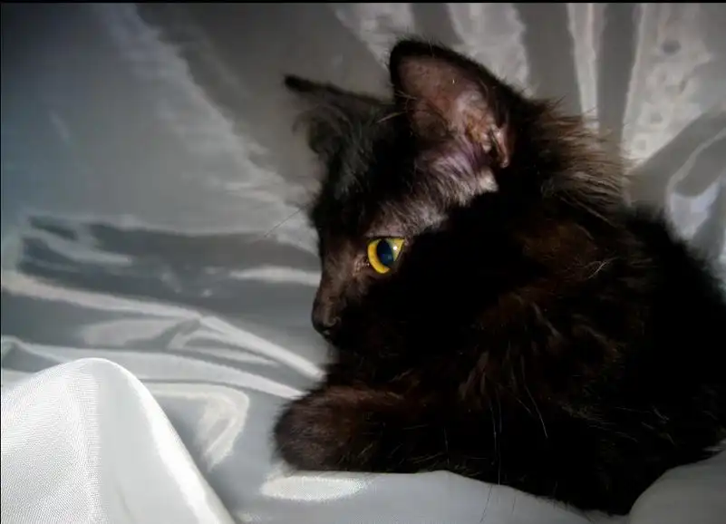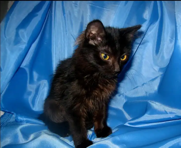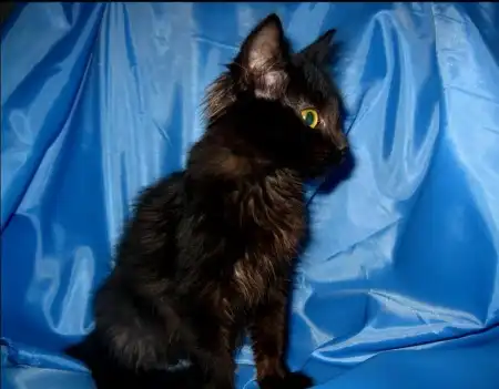 Как вы уже заметили - темно черный окрас, без единого белого пятнышка, на шее - каштановый оттенок. И это при таких выразительных желтых глазках, которые смотрятся очень философски у такого малого создания.