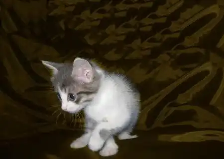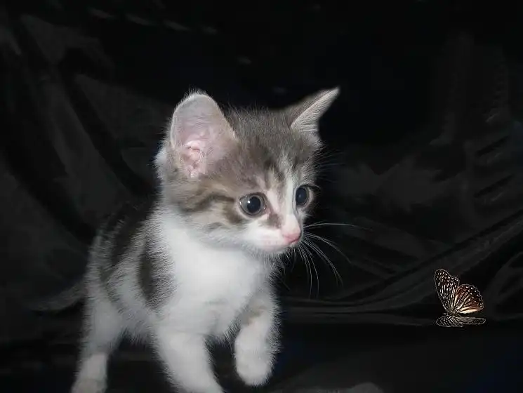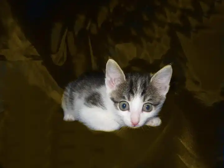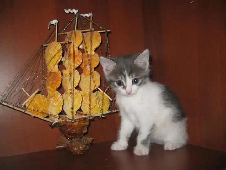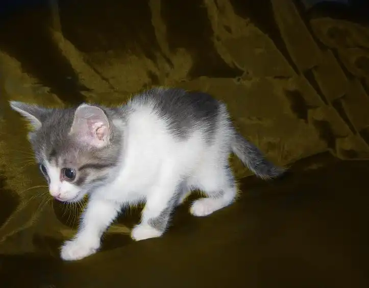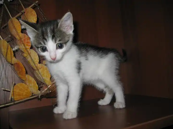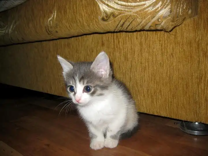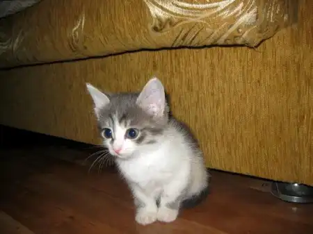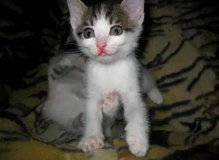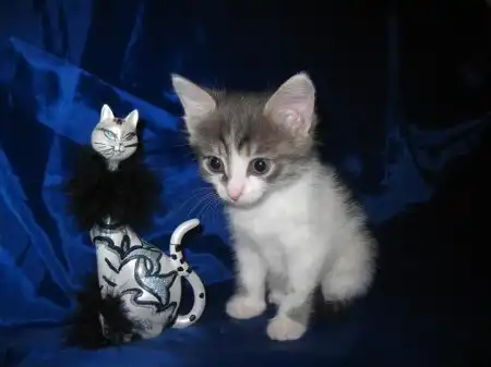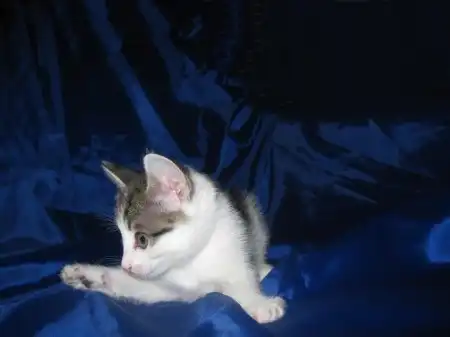 Пуговка, 1 мес.3 недели, окрас белый с голубоватыми пятнами, крупненькая, прожорливая, спокойная засонечка. Лоточек освоила, но надо последить.