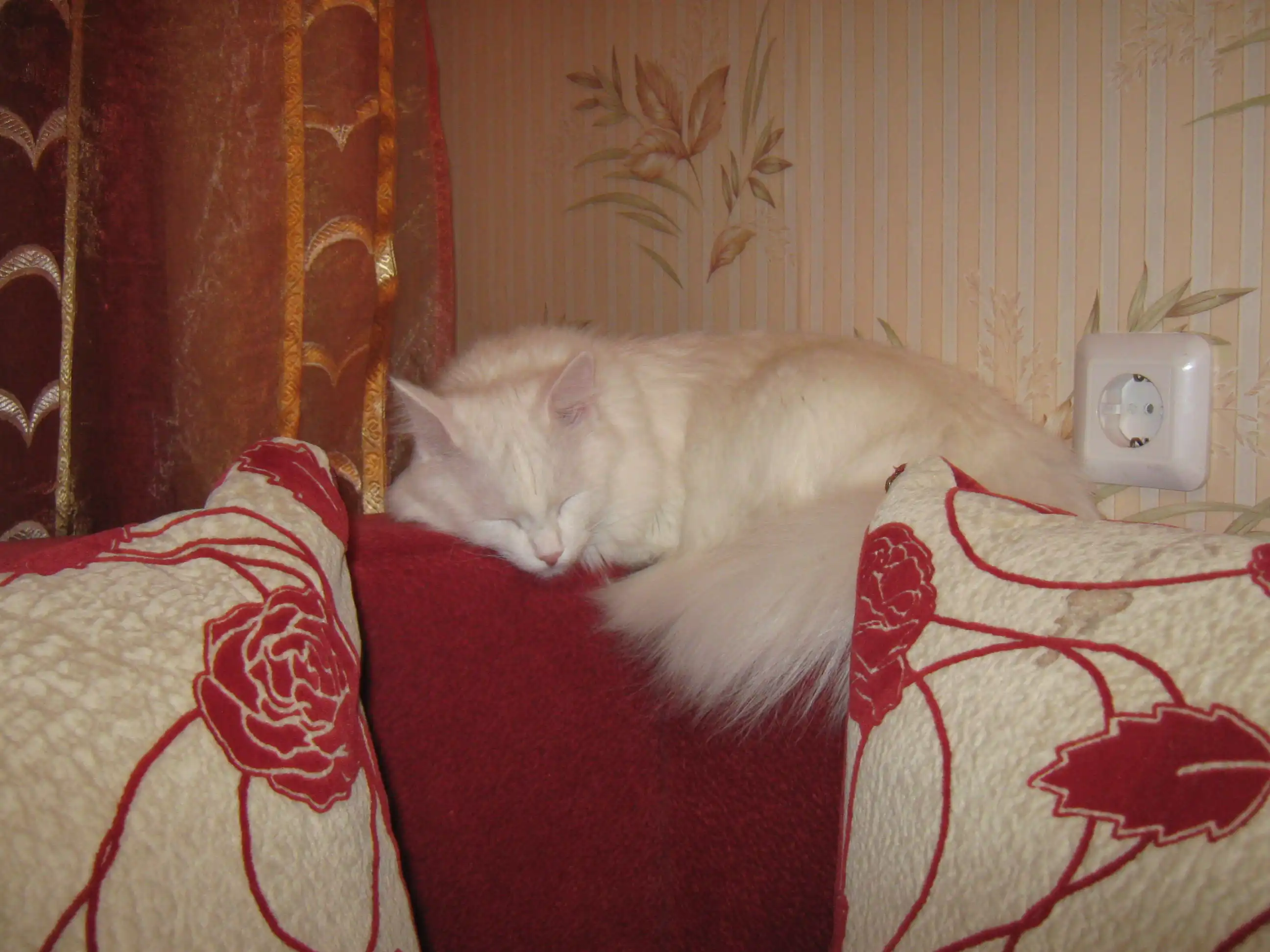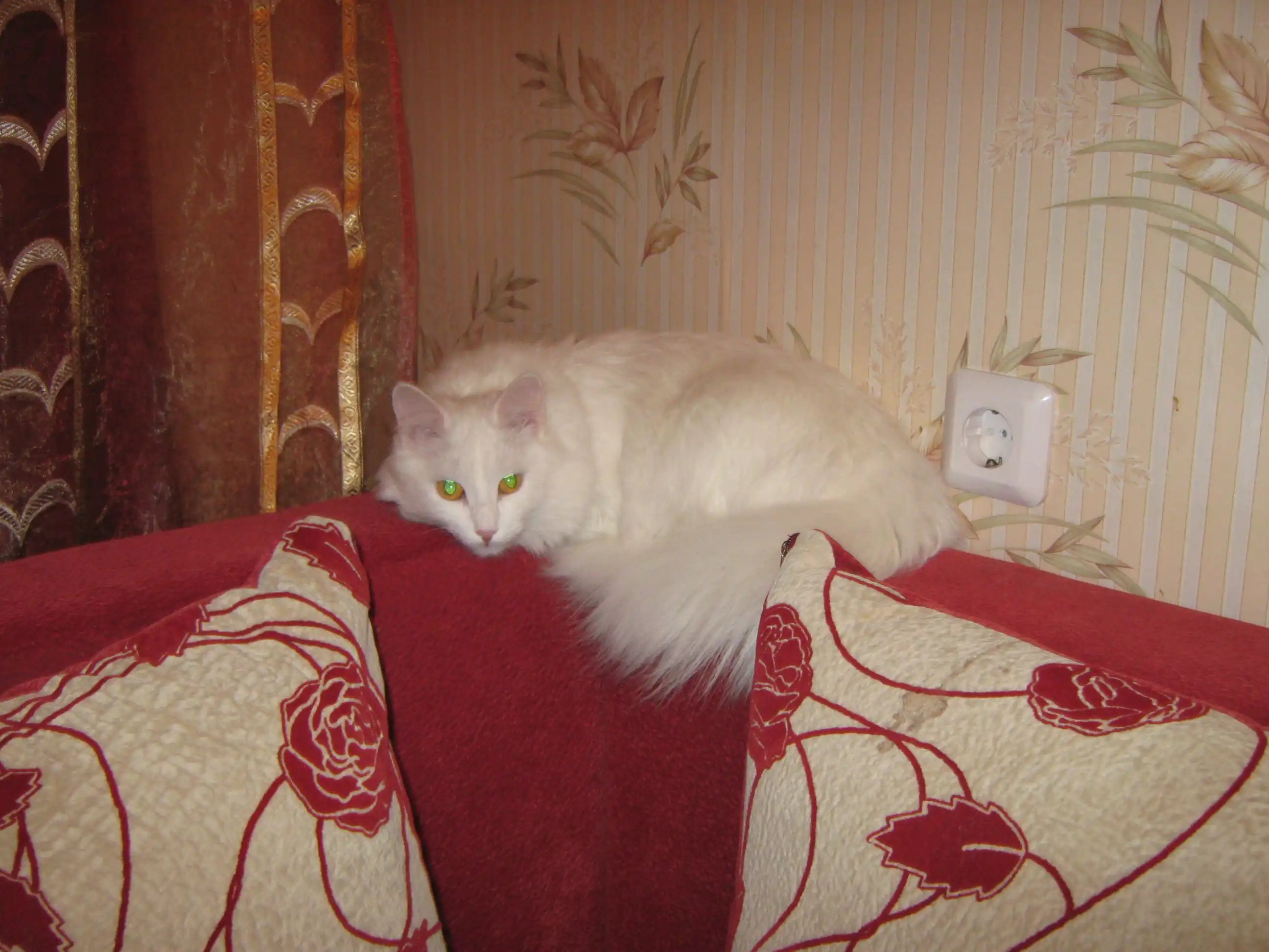 кошка белого цвета.очень ласковая часто мурлычит. желательно в часный дом . плохо слышит.
