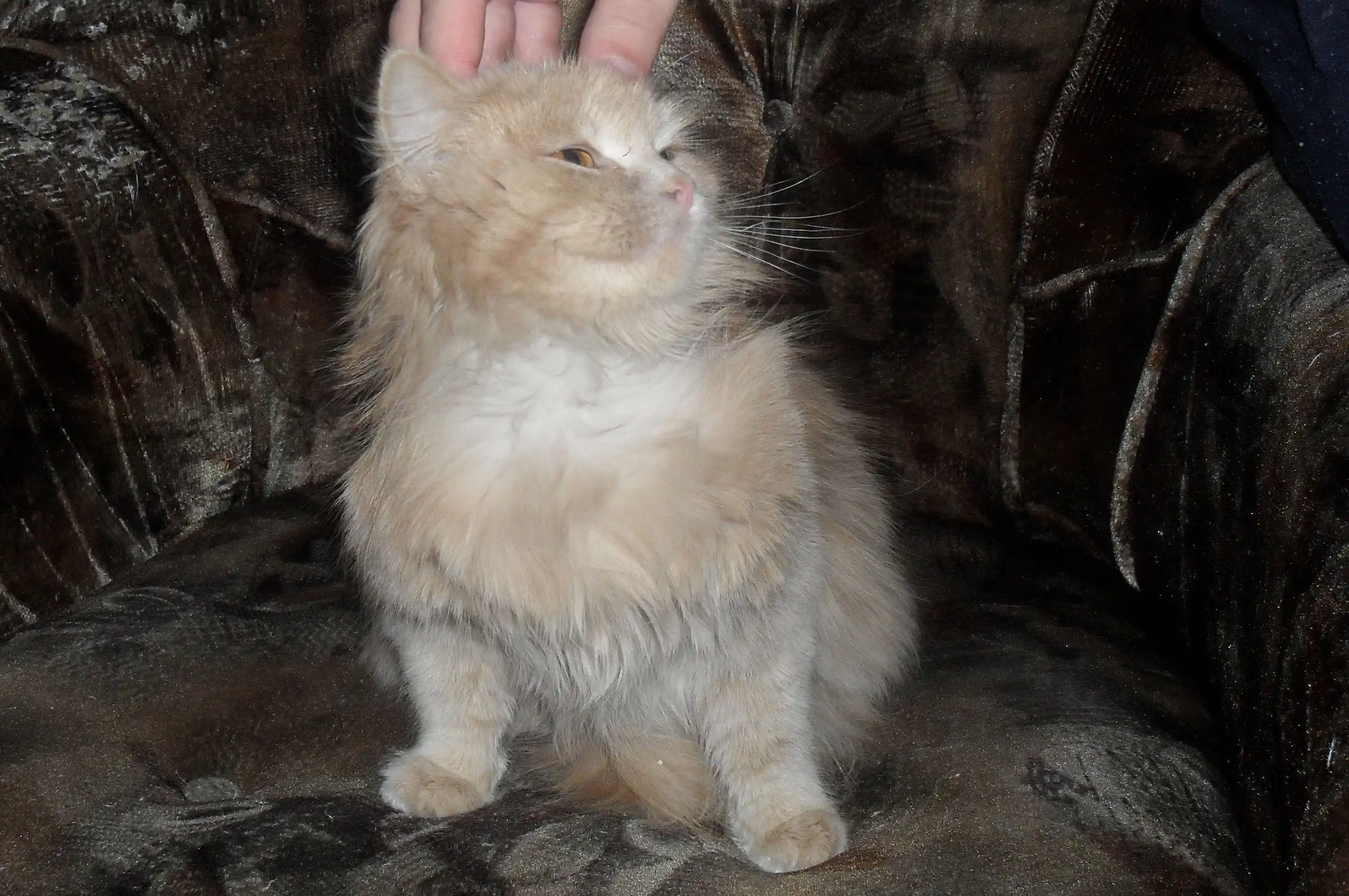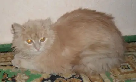 Котяра ласковый и пущистый, любит лежать "блином" на коврике, необычный окрас радужки - может породистый?