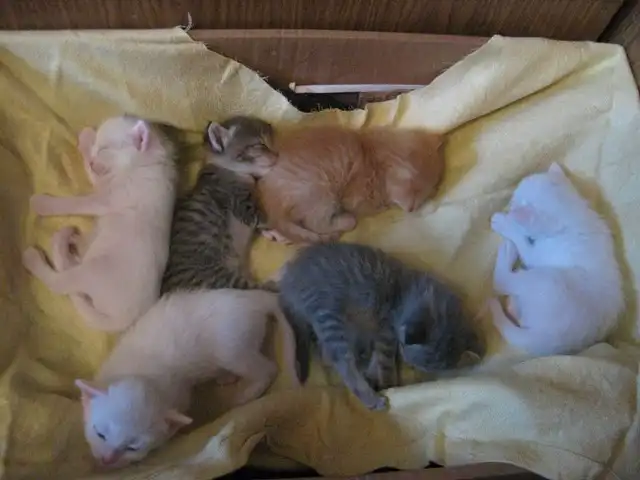 Трое беленьких: 2 белых с небольшим серым пятнышком на голове - мальчики, чисто беленькая возможно девочка, но непонятно пока, глаза у нее похоже будут синие.
