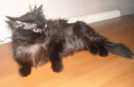 Пушистый абсолютно чёрный кот ищет дом. Кот был найден в подъезде и взят на передержку. Он крупный, упитанный, кушает хорошо, ходит в лоток (комкующийся наполнитель). В родне видимо где-то персы наследили. Кастрирован. Характер спокойный, к другим котам не агрессивен. Очень тёплый :) На фотографии не видно всей его красоты.