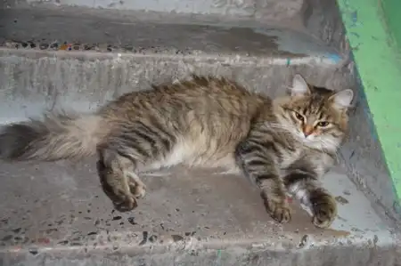 В подъезд выбросили кошечку, уже живет там около недели. Чистая, пушистая, ласковая, на вид не старше года.