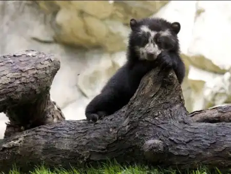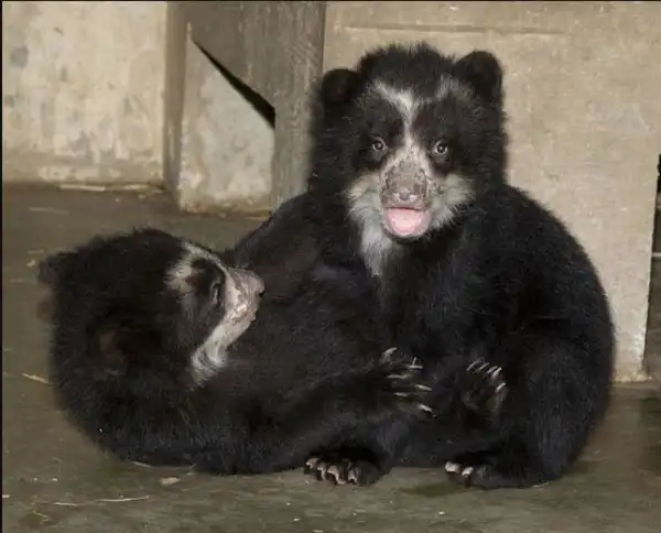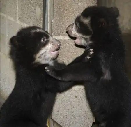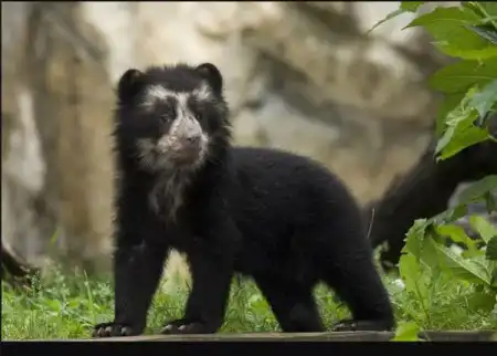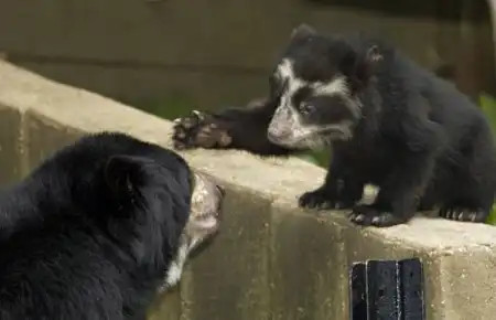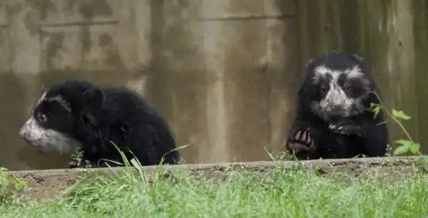 Очковый медведь (андский медведь, Tremarctos ornatus) - это единственный вид медведей с "короткой" мордой. Численность очковых медведей невысока (исчезающий вид), они внесены в Красную книгу Международного союза охраны природы. В январе в Национальном зоопарке родились двое здоровых медвежат, далее на фото их первая прогулка, это было в апреле.