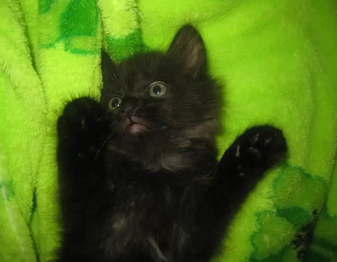Котеночек один шел по трассе дороги, мимо ехали машины. Малыш кричал. Не описать, наверное, каково было его состояние. Котенок ручной, что говорит о контакте с людьми. Худенький и пыльный. Скитался не долго. Но был ооочень голоден. Пока шли до дома - он обхватил за шею и на ушко мурлыкал свою грустную историю...Малыш очень красивый. Морда немного вытянутая. Черный окрас отливает шоколадным. Кис игривый, смышленыш. Привычки и повадки изучаем.Лоток понял и принял. Молодец, малыш!